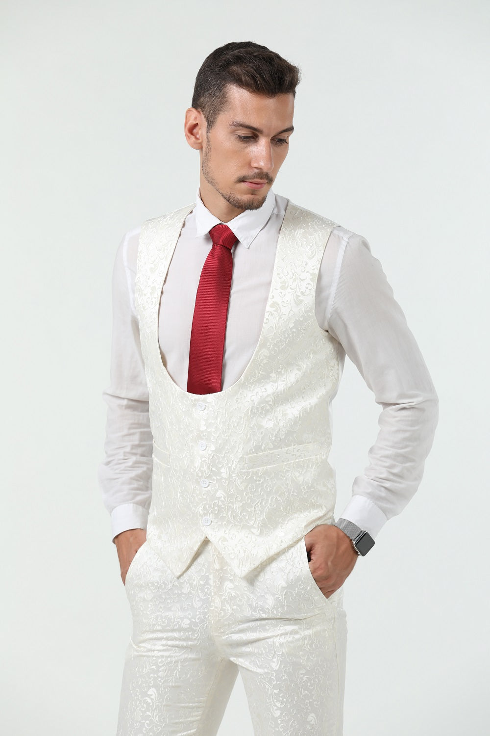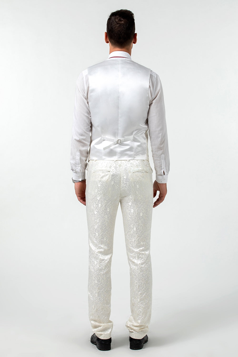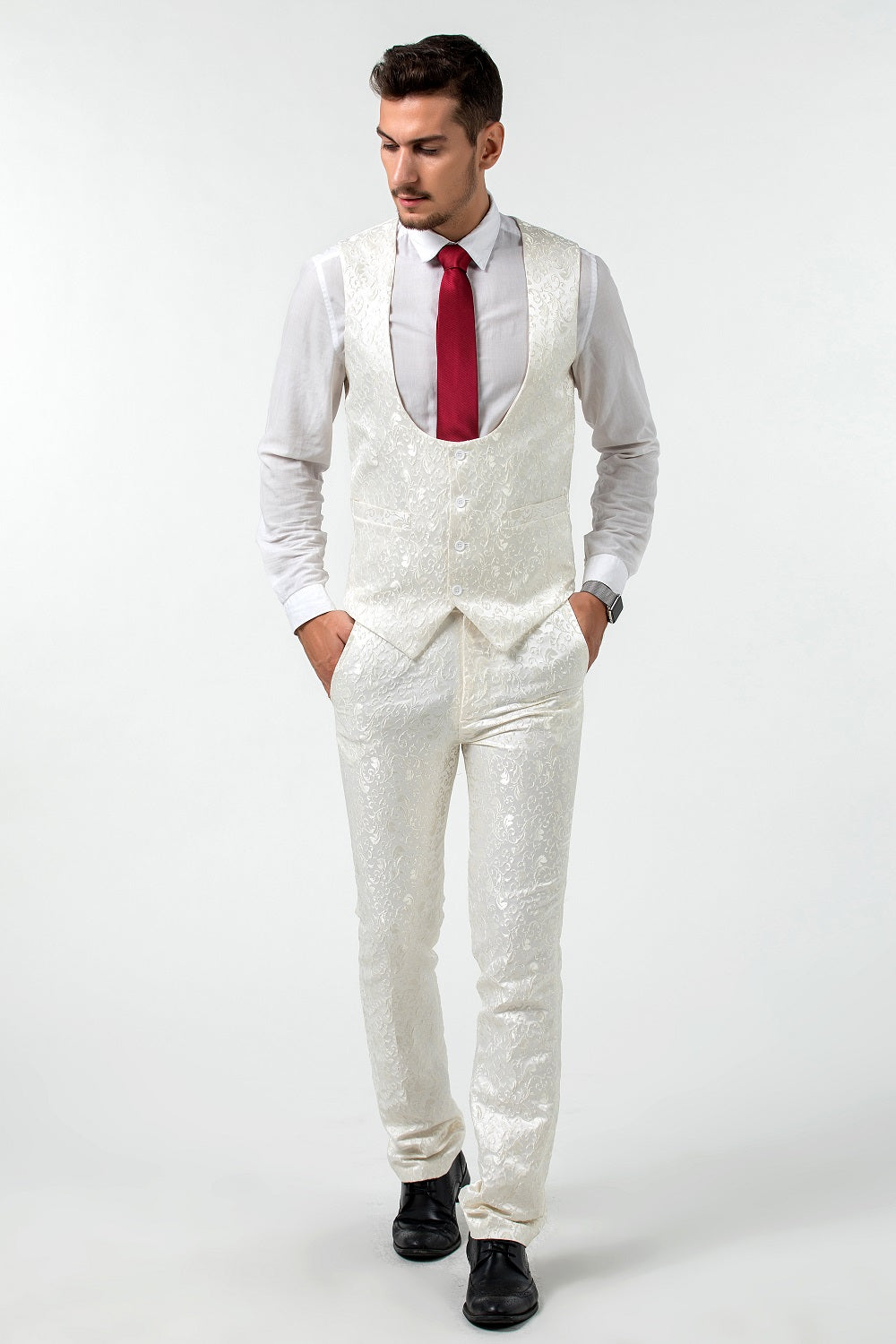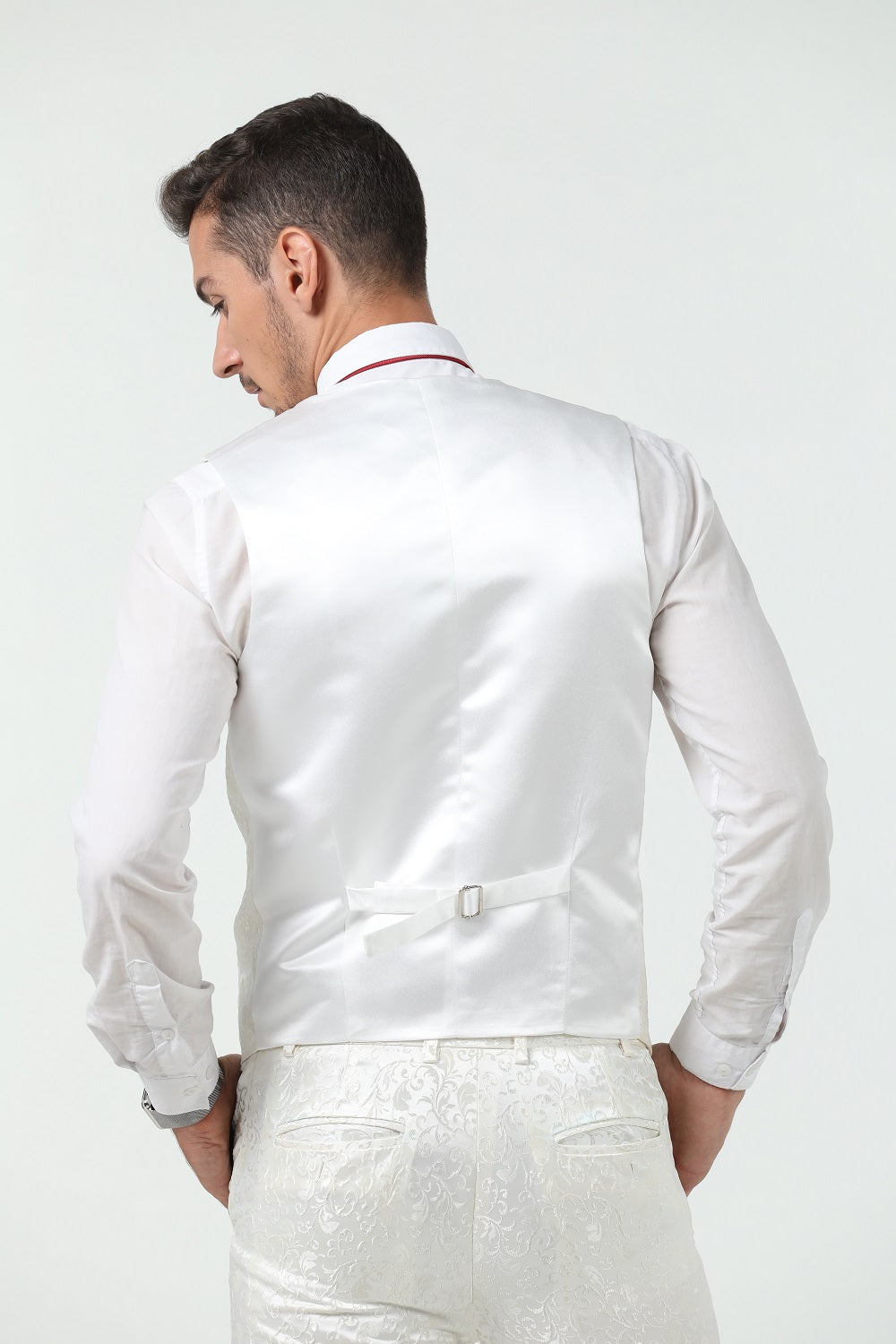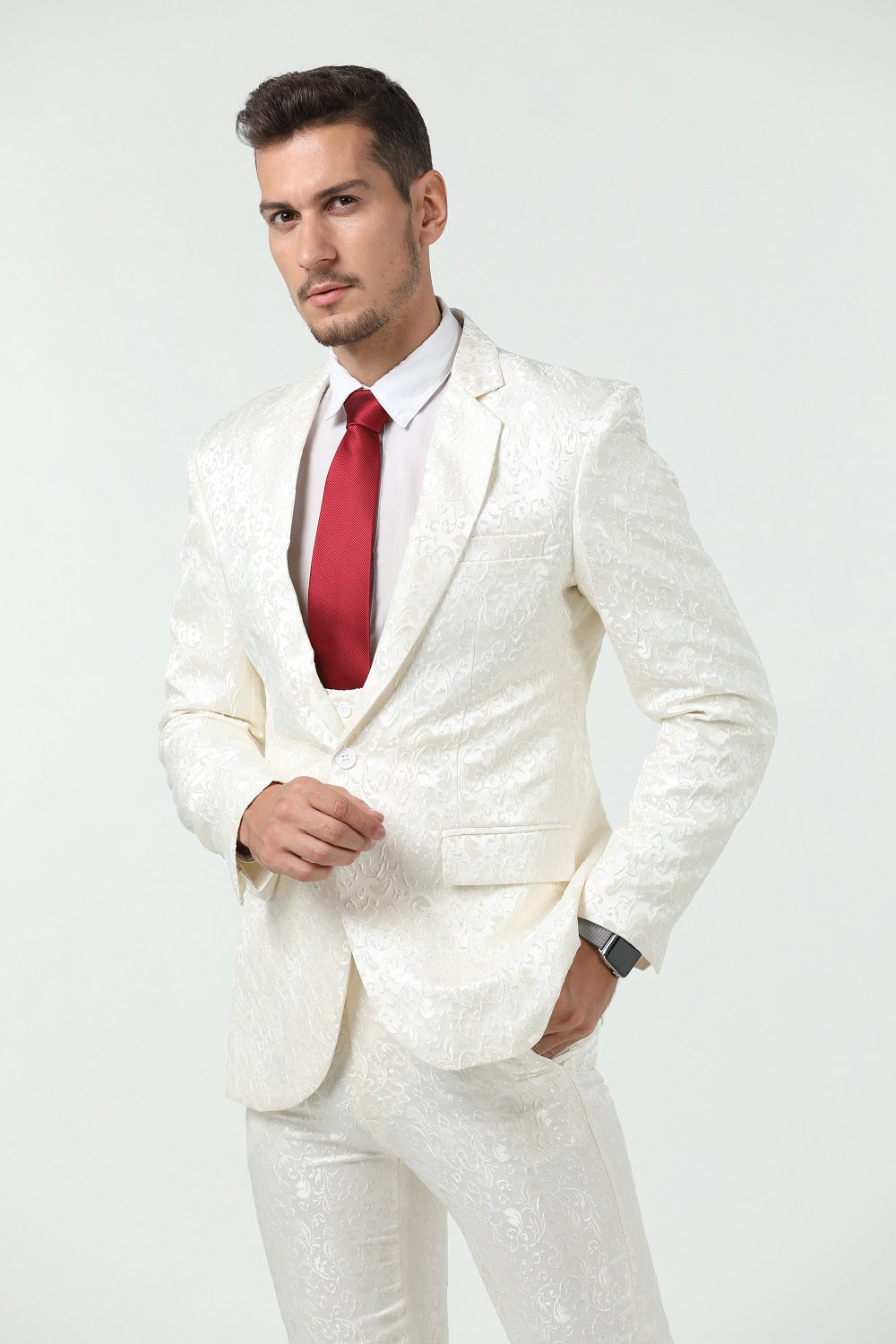 بدلة ضيقة - تتميز هذه البدلة بتصميم كتف كامل وقصّة ضيقة مع درزات ثلاثية الأبعاد. تناسب البدلة الضيقة بشكل أضيق قليلاً من البدلة العادية. عندما ترتديها، تجعلك أكثر رشاقة وجاذبية. وتبدو عصرية ووسيمًا.